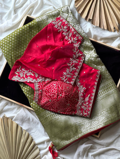 banarasi silk saree in green Teamed with red bandhej stiched blouse