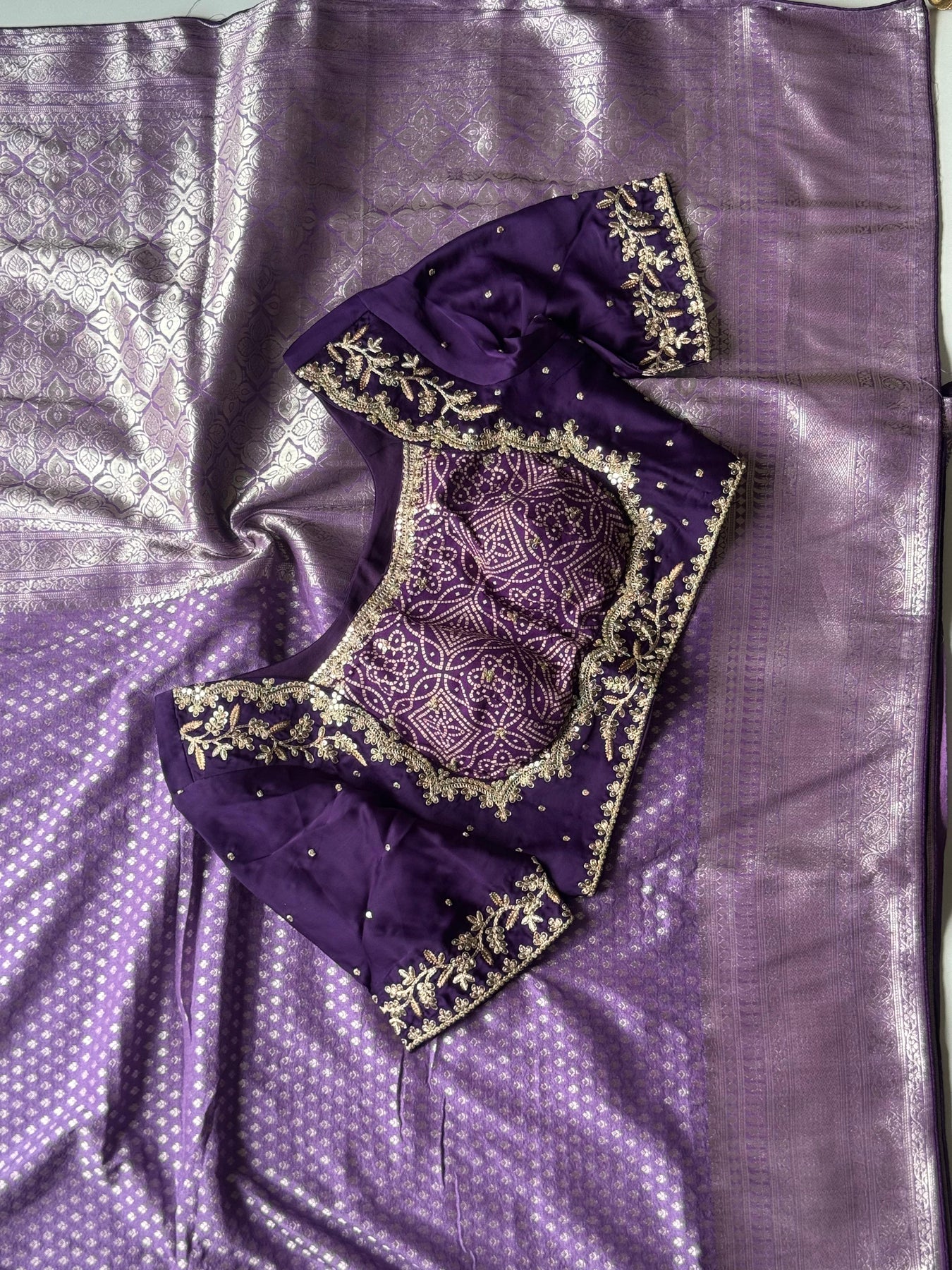 banarasi silk saree in purple Teamed with bandhej stiched blouse
