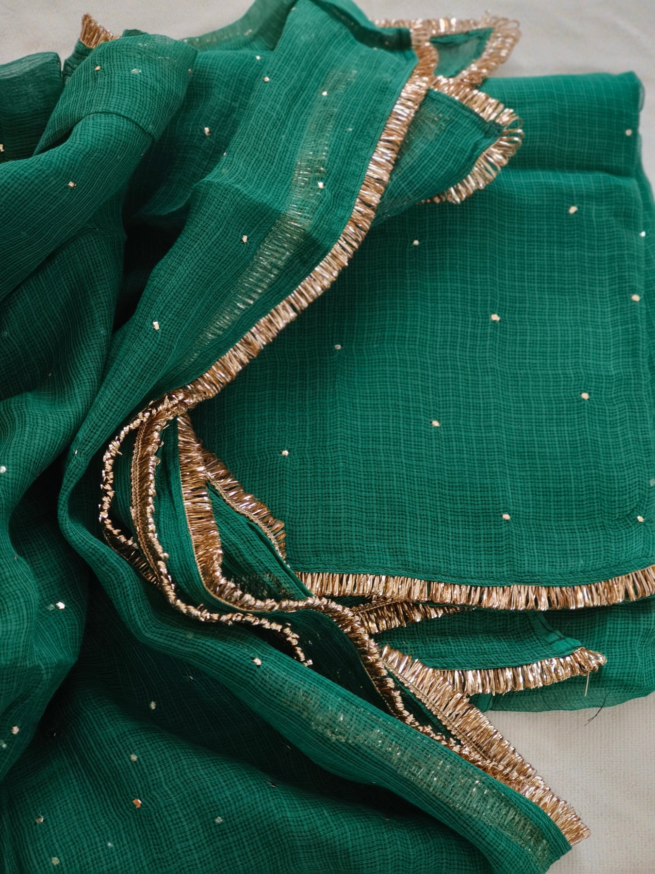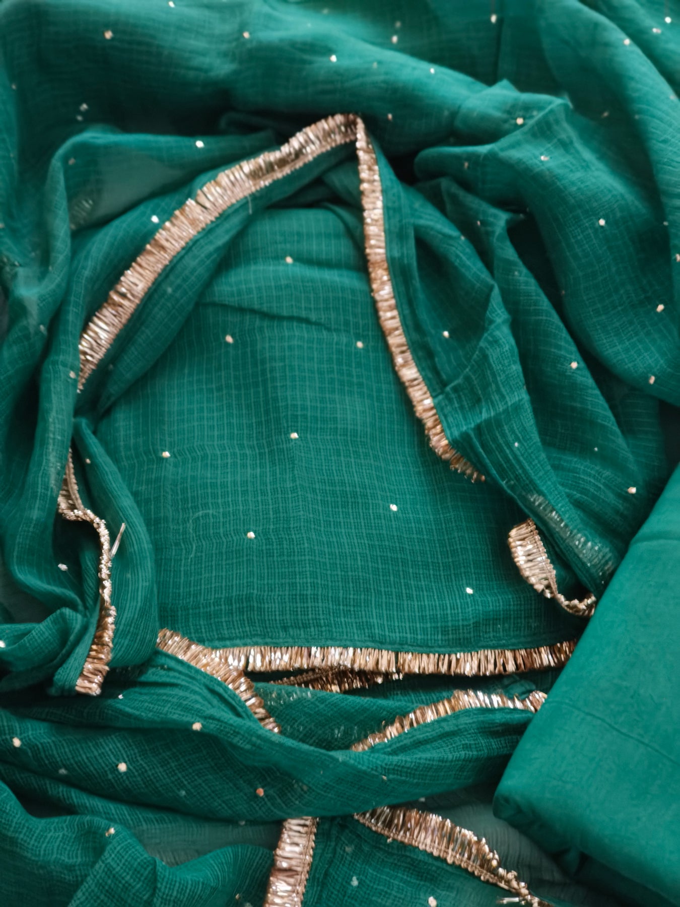 Work: Mukesh work kurta , all over mukesh work dupatta, compliment with kiran lace